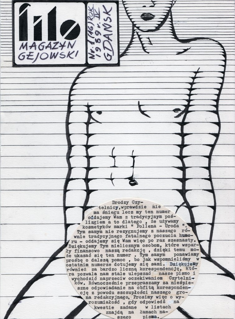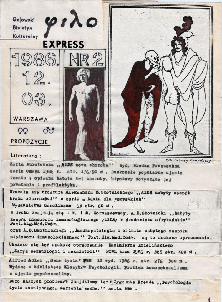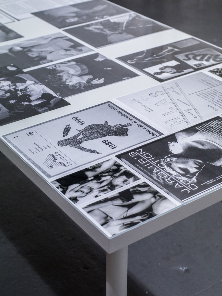 For now, Karol sees himself in a moment of collecting. A couple of recent exhibitions of the Queer Archives Institute, including most recently at Centrala in Birmingham, have given him the opportunity to experiment with how to display his research. Arranged as a collage, he juxtaposes a selection of contemporary documents with older archival material, texts and his own works. The highly curated selection barely scratches the surface of his collection, and Karol has considered gathering all the material onto a vast online platform. Currently, though, the process remains experimental and unfixed, allowing unfettered access to a network of voices across the region collectively writing their own queer histories.